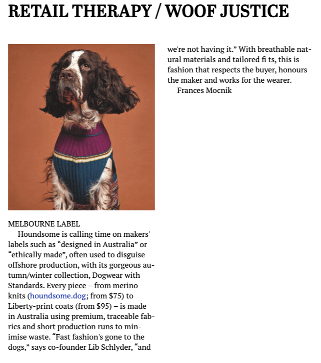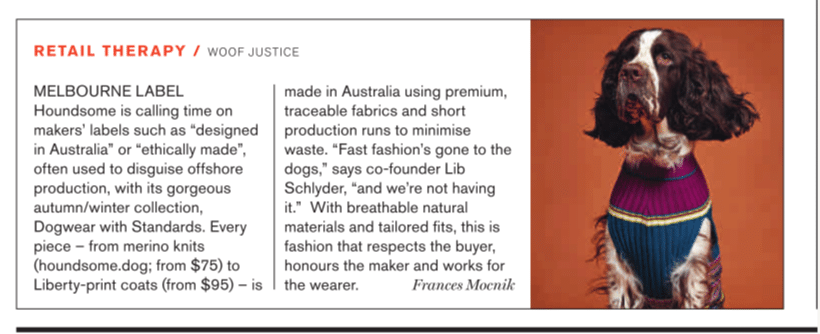 In 2025 we helped launch the new range of ethically produced dog wear from Houndsome. The range is made in Australia from natural fibres. It’s dogwear with standards. We pitched this to lifestyle media, environment media, fashion media and pet media. We secured placement in the Good Weekend, a full page in Green Magazine, The Sunday Times Magazine (WA), The West Australian online and also a mention in the Sydney Morning Herald.